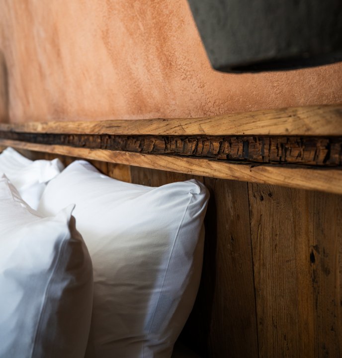 Otel odasında ise, eski bir konaktan sökülen ceviz ve dut kirişleri tek parça bir yatak platformu olarak kurguladık. Ahşabın aşınmış yüzeyi zeminle bütünleştirilerek, geçmişin izlerini taşıyan zamansız bir konfor alanı oluşturuldu. Minimum müdahale ile yapılan bu uygulama, modern konaklama anlayışına güçlü bir ruh kattı.