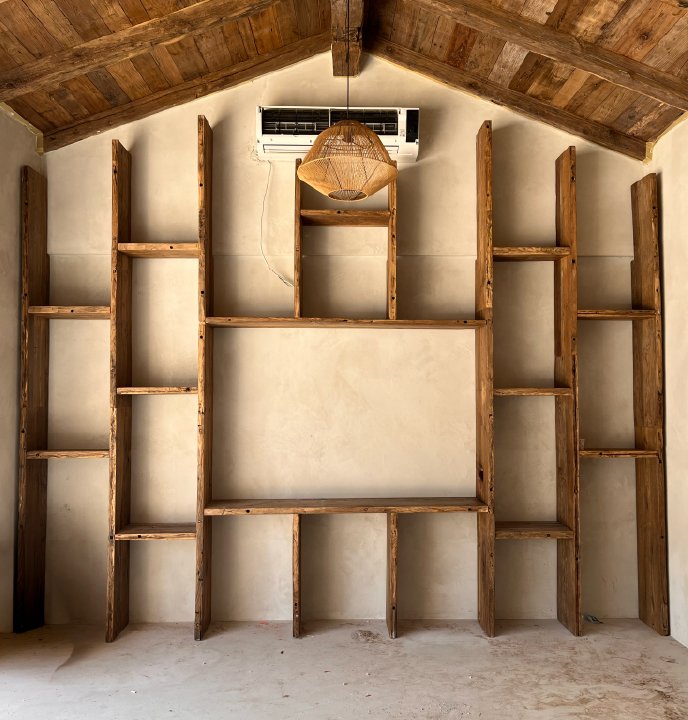 Bu projede, Alaçatı’nın taş dokusuna uyum sağlayan, hikâyesi olan ahşaplarla mekân kurgusu yaptık. Otelin lobi ve odalarında, eski köy evleri ve konaklardan sökülmüş meşe, kestane, ceviz ve dut kirişleri yeniden işleyerek özgün mobilya ve sabit elemanlara dönüştürdük.